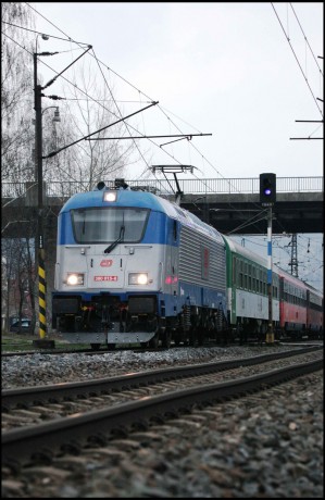 380 015-8 naberá rýchlosť smer Praha. Nie som veľkým priaznivcom moderného dizajnu lokomotív, ale táto kráska ma uchvátila svojim spracovaním a krásou. Zvuk rozbiehajúcej sa 380 015-8 a jej podvozok je pastva pre ucho i zrak..